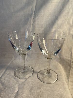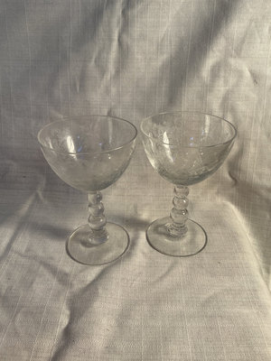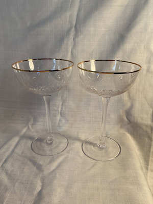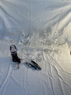 Collection of stemware including wine glasses and champagne coupes, plus corkscrews and a Vinturi wine aerator.