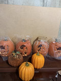 A group of pumpkins: two uncarved orange pumpkins, several carved jack-o'-lantern pumpkins in plastic bags, and a brown ornate pumpkin decorative piece with cutout patterns.