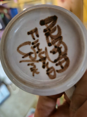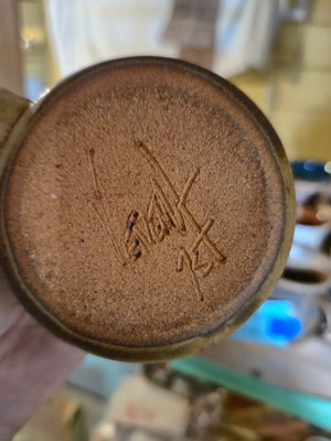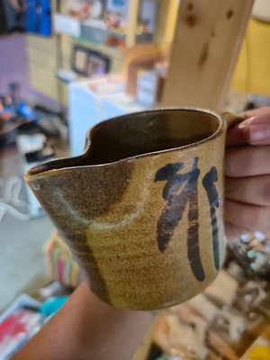 A collection of handmade ceramic pottery pieces including multiple mugs and cups with earthy brown and black glaze patterns, cream & sugar set, and a spouted pitcher, all with textured surfaces. **BRING OWN PACKING MATERIALS, as is as found.