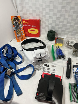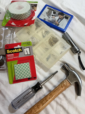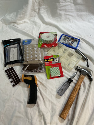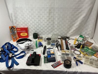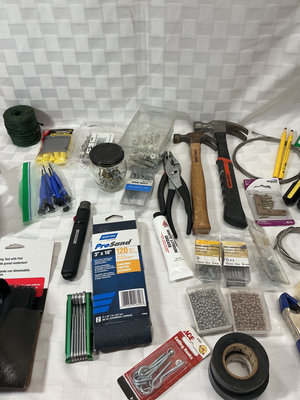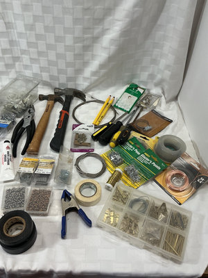 A collection of hardware tools and supplies including hand tools (hammer, pliers, screwdrivers, utility knife), fasteners (screws, nails, nuts, bolts, washers), electrical and workshop components.