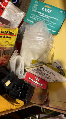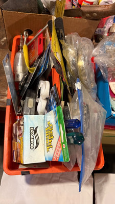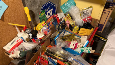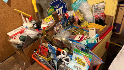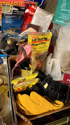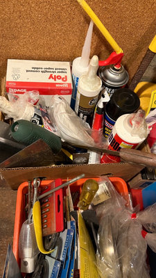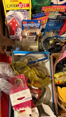 A mixed collection of hardware and workshop items including hand tools, fasteners, sealants and adhesives, safety gear such as gloves and goggles, cutting and measuring tools, and assorted packaging. As is as found. ** BRING OWN PACKING MATERIALS