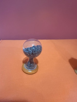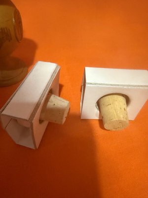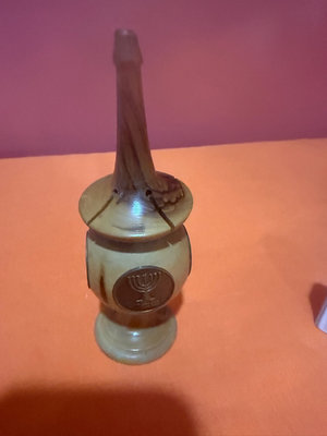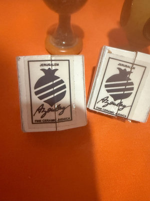 A collection of small Judaica ceramic items, including boxed pieces labeled Jerusalem Fine Ceramic Judaica, several miniature wooden and ceramic components, a wooden finial/peg, a small glass sphere on a wooden stand with decorative blue material, and additional cork and box-like hardware pieces.