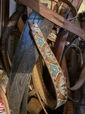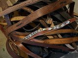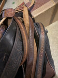 A pile of leather belts with decorative tooling, beadwork, and branding in brown and black tones.
