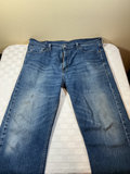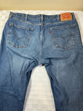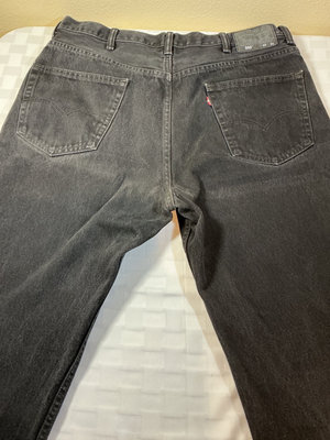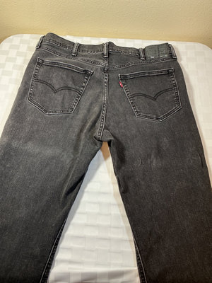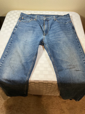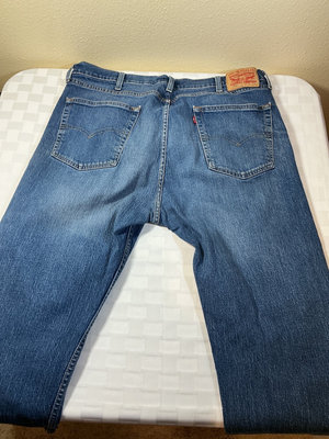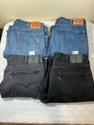 A collection of denim jeans in blue and black washes, including multiple Levi's styles with back pockets and red Levi's tabs. Sizes 40 x 30 for 3 pair, and one is 38 x 30.