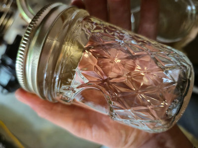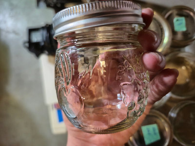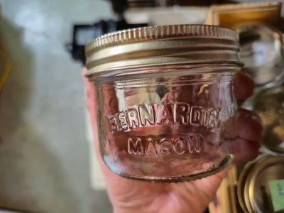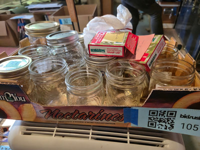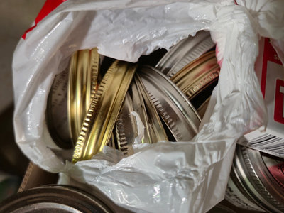 Several embossed glass mason jars with metal screw-on lids, a cardboard box containing jars, and a plastic bag filled with metal jar lids.