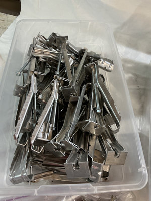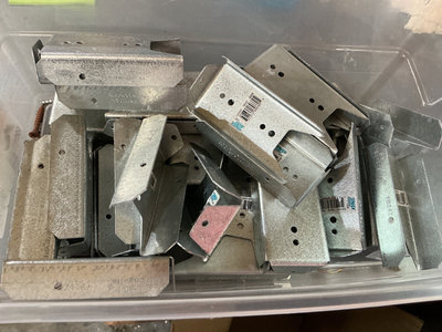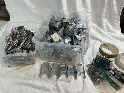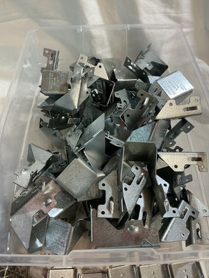 A collection of galvanized metal brackets, gutter mounts and related fasteners.