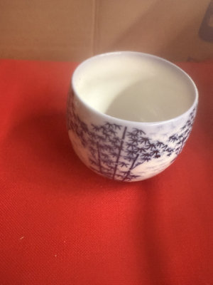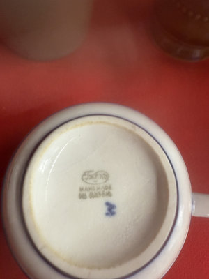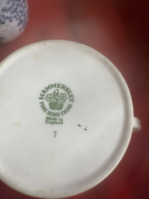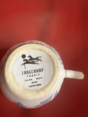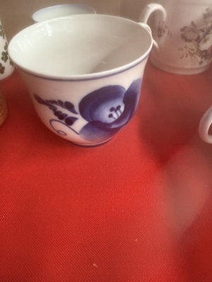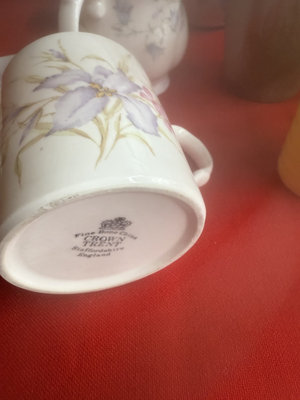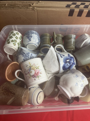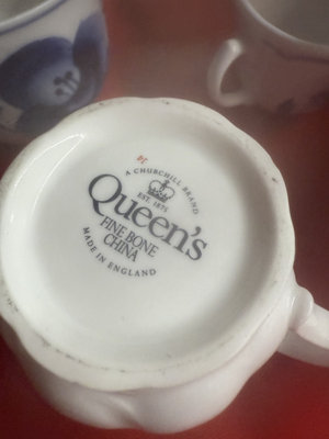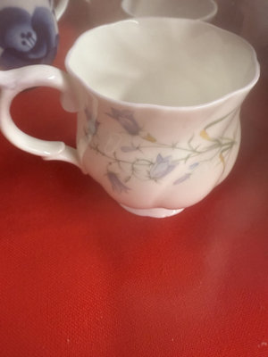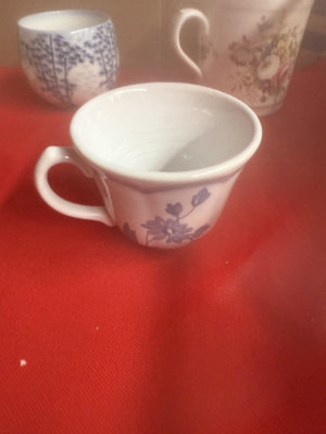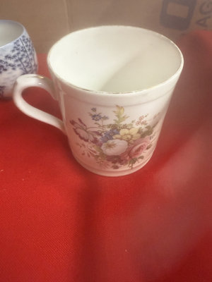 A collection of mugs, teacups, and small ceramic pieces, including bone china from Queen's and Longchamp and stoneware from other makers, featuring floral, blue-and-white, and neutral glazes.