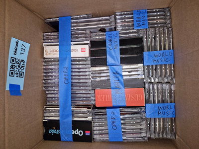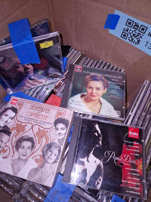 A collection of compact discs in cases, stacked together, featuring classical, opera, and world music titles. Opera, World Music, Choral Music, Mahler. ** BRING HELP TO MOVE OUT OF BASEMENT