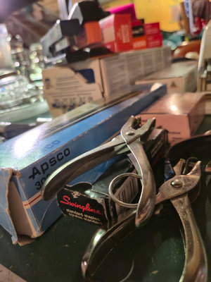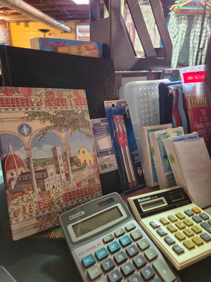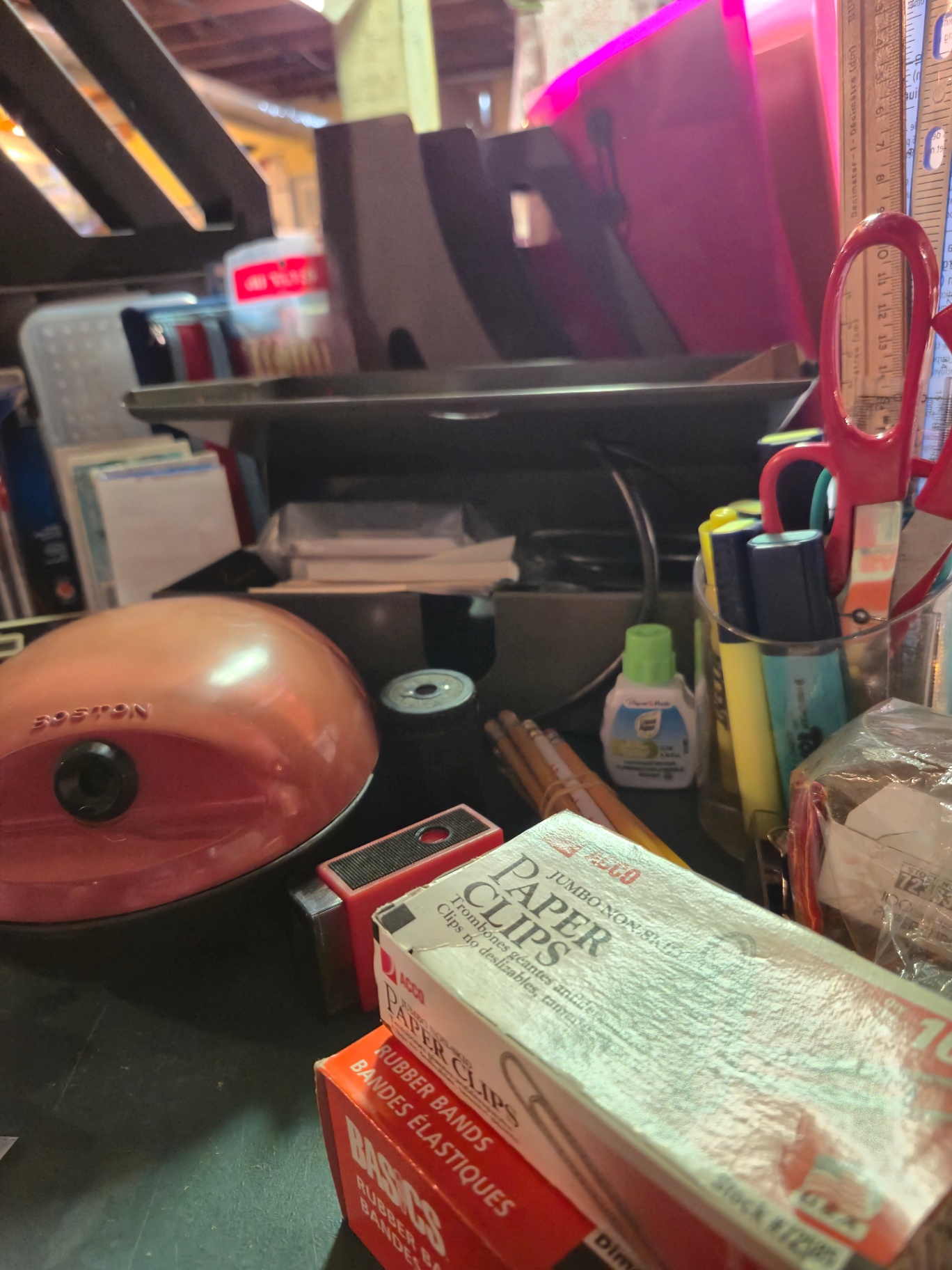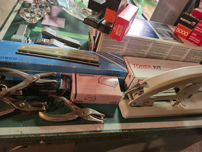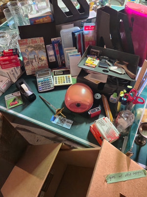 A collection of office supplies including calculators, staplers, punches, tape, scissors, pens, pencils, notebooks, clipboards, and a small ornate sword letter opener. ** BRING OWN PACKING MATERIALS