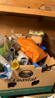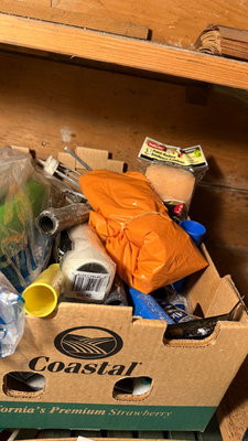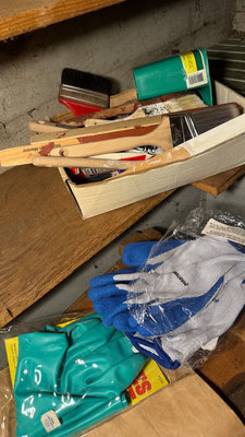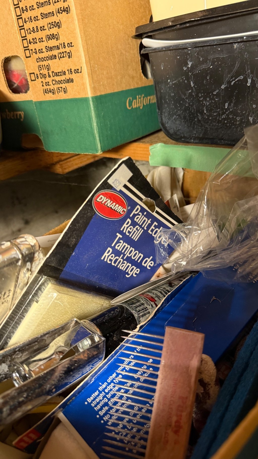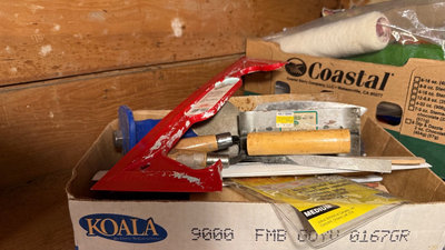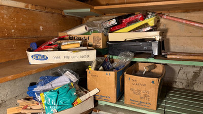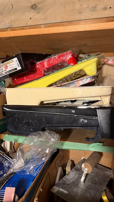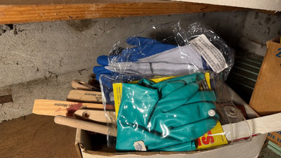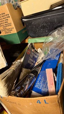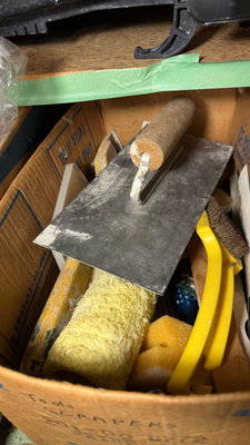 A collection of painting supplies and hand tools including paint edgers, scrapers, brushes, rollers, gloves, sponges, and related accessories stored in boxes and bags. **BRING OWN PACKING MATERIALS