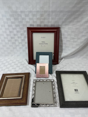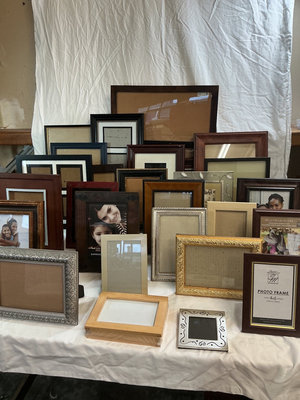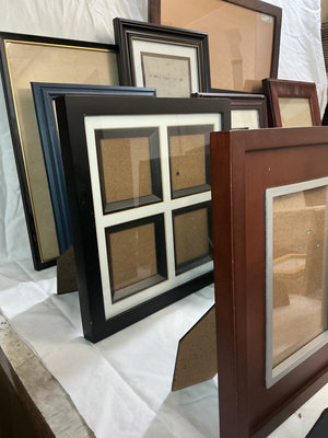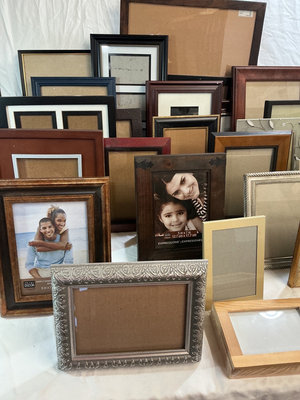 A collection of empty picture frames in multiple styles and finishes (wood, metal, ornate and plain) arranged together.