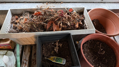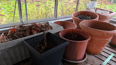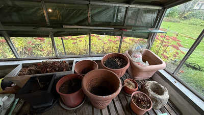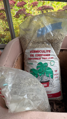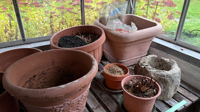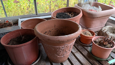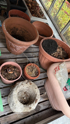 An assortment of terracotta and plastic plant pots in various sizes, some filled with soil and dried plant material, along with a large decorative stone planter, several containers with soil and debris, and a bag labeled Vermiculite Soil Conditioner. **BRING OWN PACKING MATERIALS