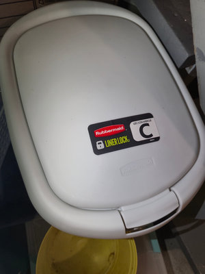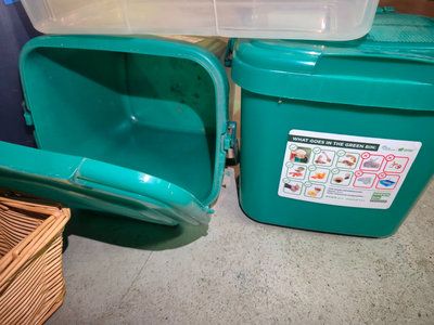 A collection of plastic storage bins, totes, baskets, and containers in various colors and shapes, including a white Rubbermaid bin, a green recycling bin, clear plastic boxes with lids, a yellow bucket, a white perforated basket, and a wicker basket. ** EXCLUDES BLUE PLASTIC GARBAGE BIN *** BRING OWN PACKING MATERIALS