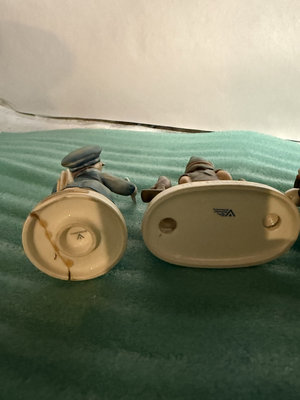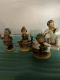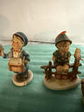 A collection of small porcelain figurines depicting people in vintage attire, including a postman with a mail parcel, a scientist/doctor figure with a bottle labeled vitamins, a person on a bench, and other figures with animals such as rabbits and birds, all mounted on small bases.