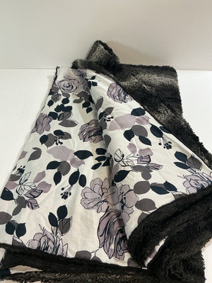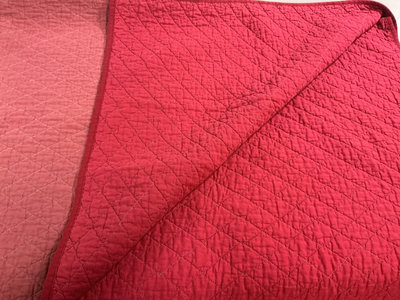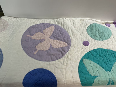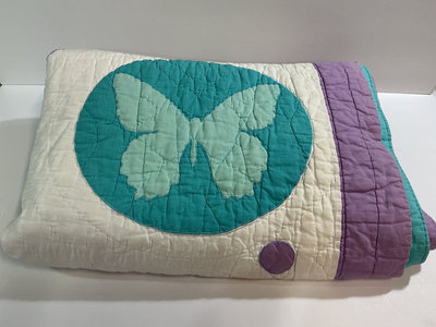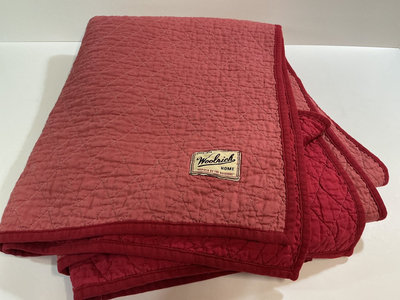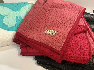 A collection of quilted blankets/throws in varying colors and patterns: a white quilt with teal circle and butterfly design and purple border, a coral-pink quilt with diamond stitching, a red/ burgandy Woolrich Home quilt, and a white floral print blanket with a black fuzzy backing.
