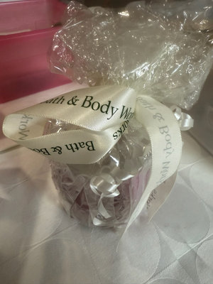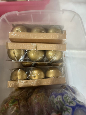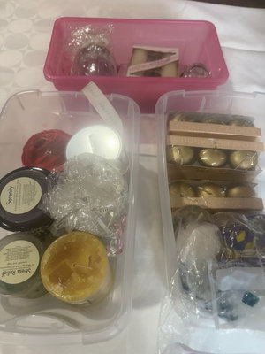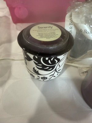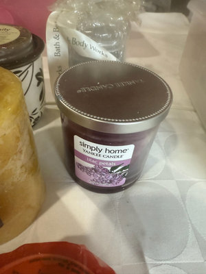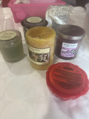 A collection of scented candles in various sizes and scents, including Serenity jar, Aroma-Mix multi-scented candle and Yankee Candle lilac petals, plus a bag of decorative floating candles and other bath & body items.