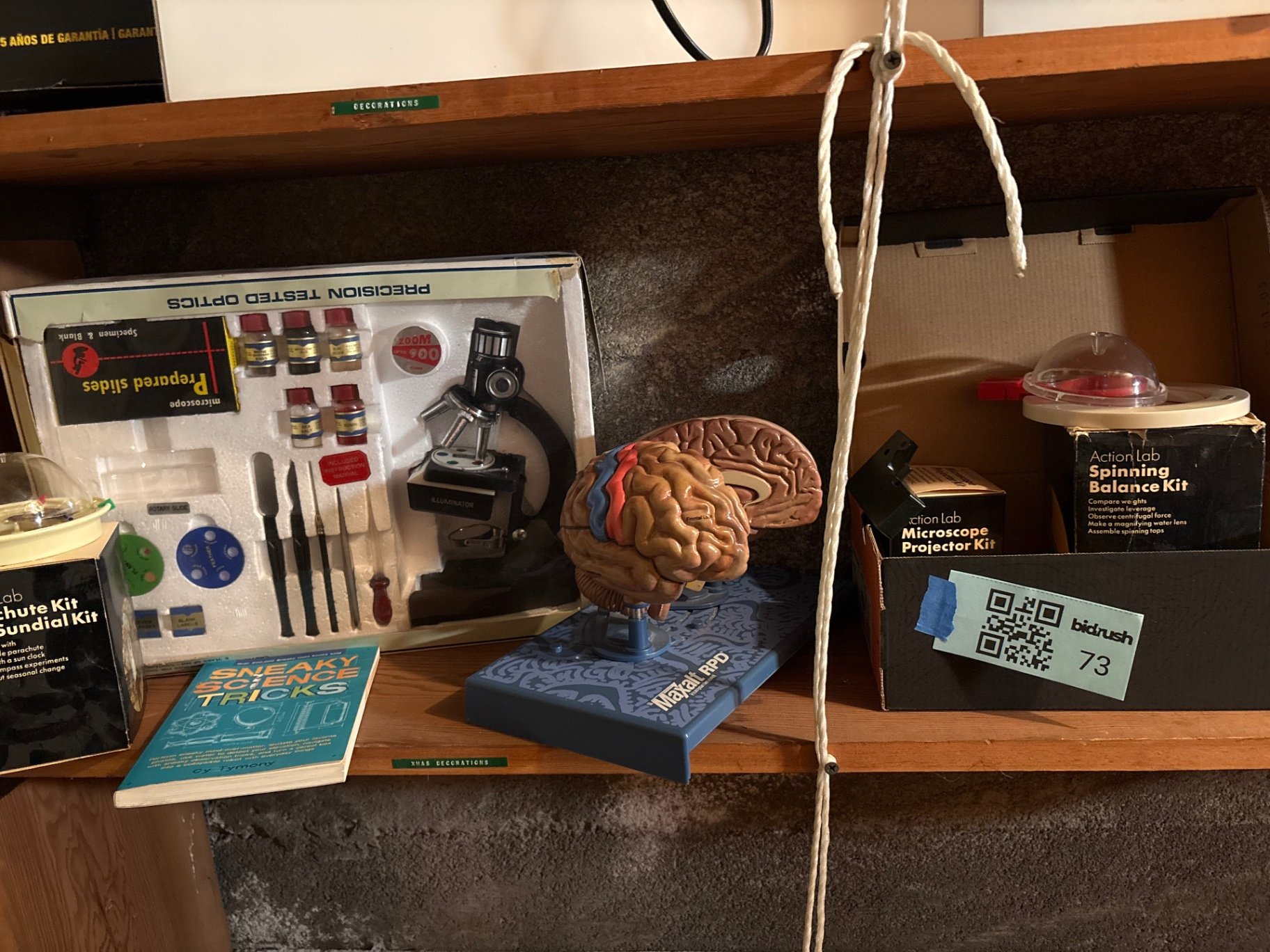 A collection of educational science gear including a brain anatomy model on a stand, a microscope kit with illuminator, a spinning balance kit, various science tools and accessories, and the book Sneaky Science Tricks by Cy Tymony.