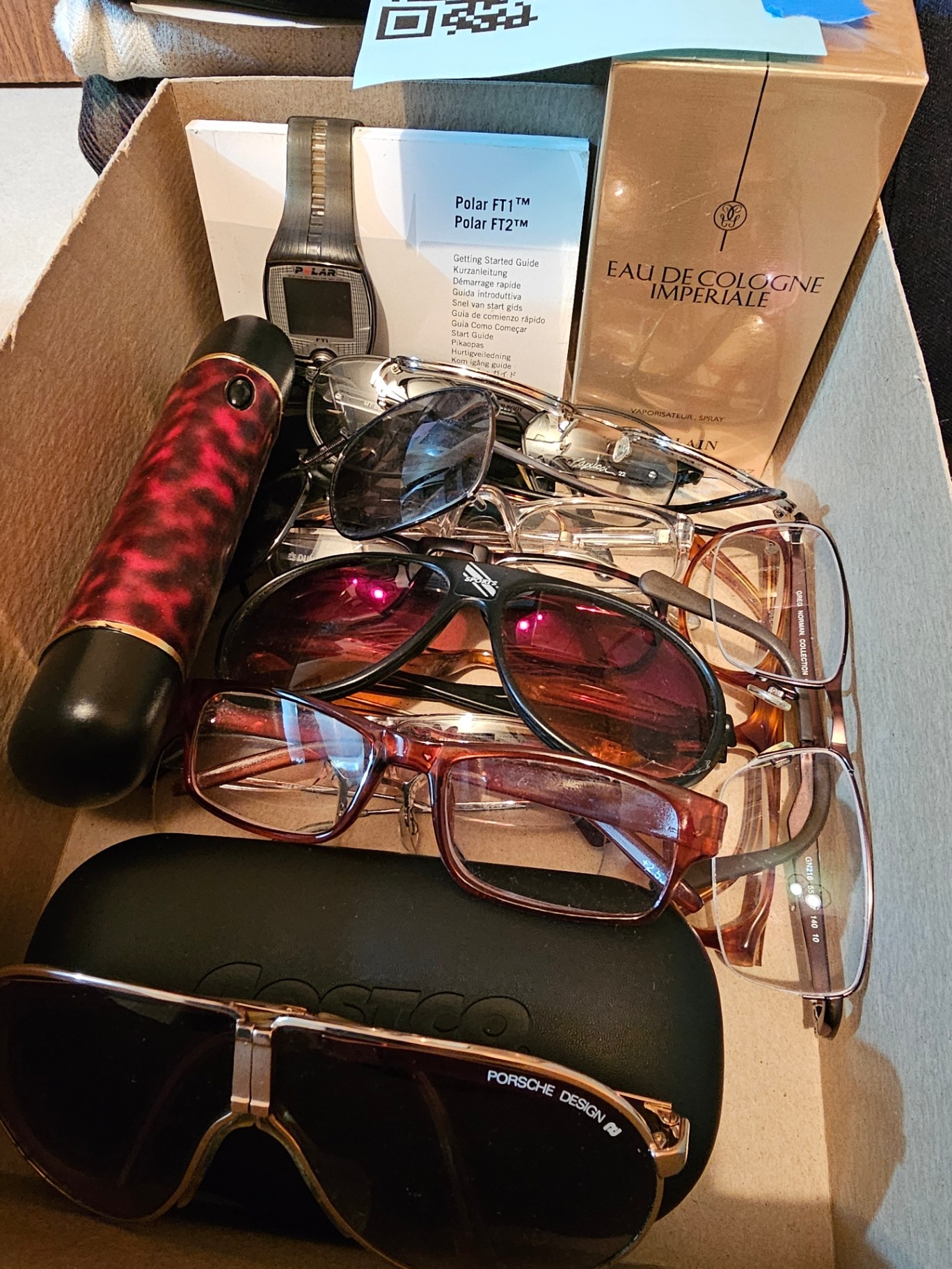 A collection of sunglasses (including vintage 1980s Porsche Design folding sunglasses) and eyeglasses frames along with multiple hard cases, a watch, and various accessory boxes including perfume/cologne new in box from Guerlain Eau de Cologne Imperiale.** BRING OWN PACKING MATERIALS