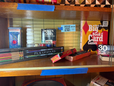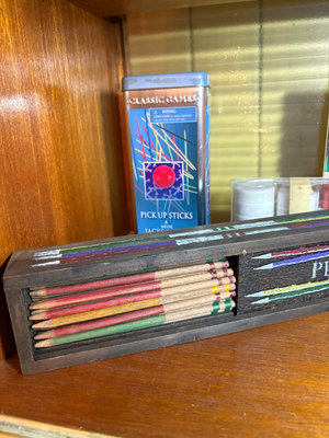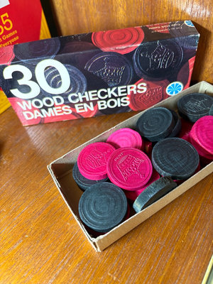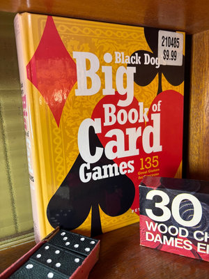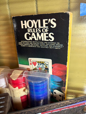 A collection of vintage and miscellaneous tabletop game items, including a large Big Book of Card Games, Hoyle's Rules of Games, a Colour Dominoes box with dominoes, a 30 wood checkers box with checkers, a Pick Up Sticks set with colored sticks, a tray of colored tokens/pieces. **BRING OWN PACKING MATERIALS, NOT TESTED FOR COMPLETENESS.