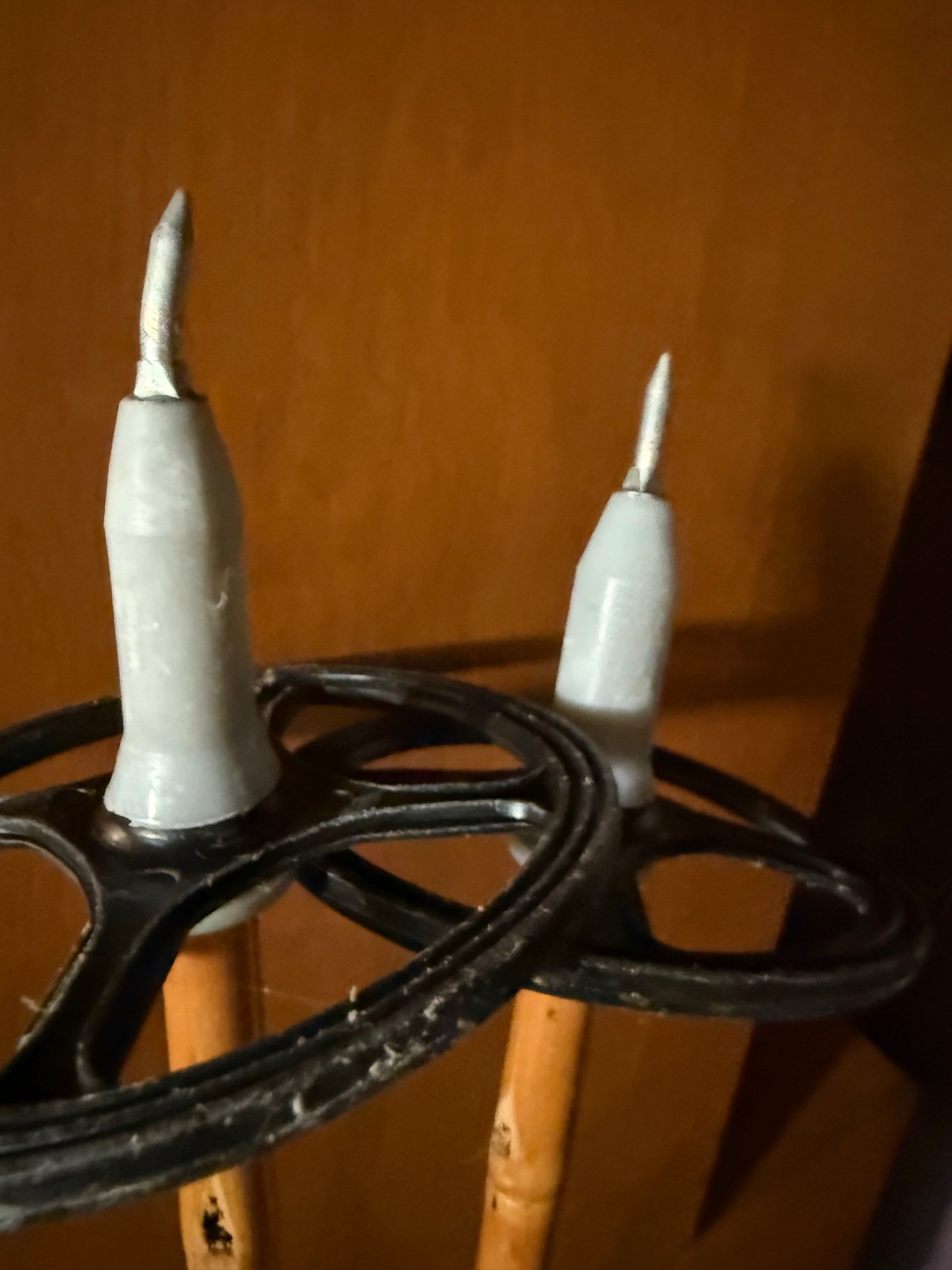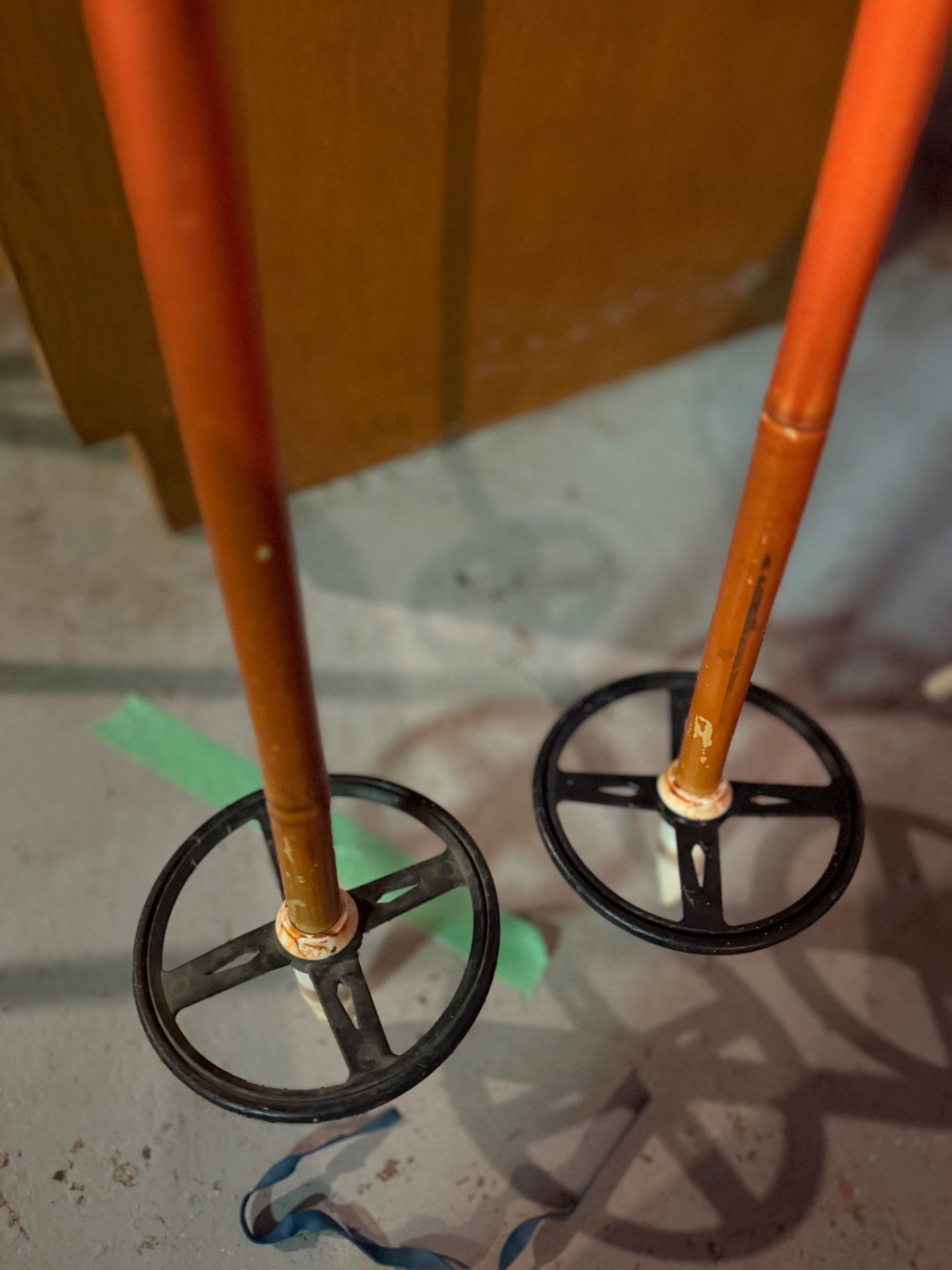 Collection of trekking and ski poles with multiple shaft colors (orange wood and blue metal), various grip styles and straps, removable baskets and tips, and related accessories.