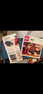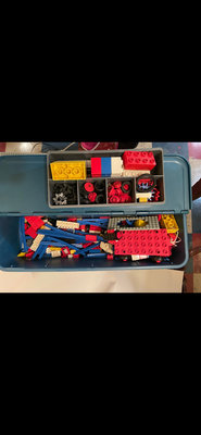 An assortment of LEGO bricks and parts in a blue storage tub, including red, yellow, white, and blue bricks, wheels, gears, plates, and small assemblies; two instruction sheets are present. **NOT TESTED FOR COMPLETENESS, AS IS AS FOUND.