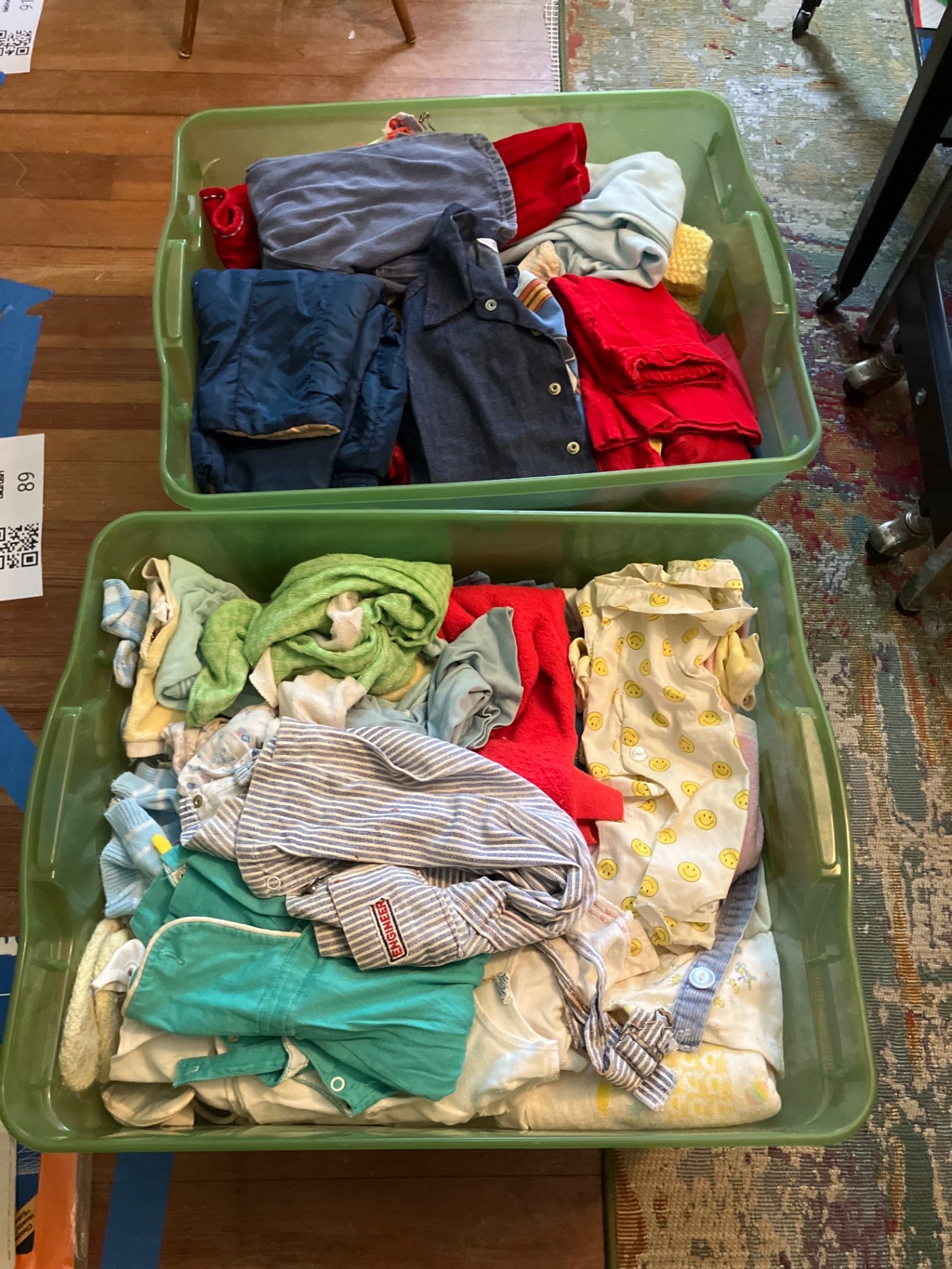 Two green plastic bins filled with a variety of children's clothing, including jackets, shirts, pajamas, sweaters, and blankets, etc.
