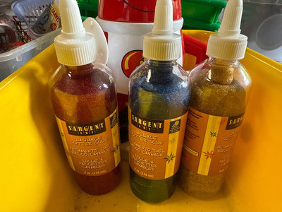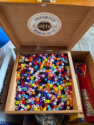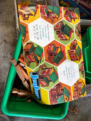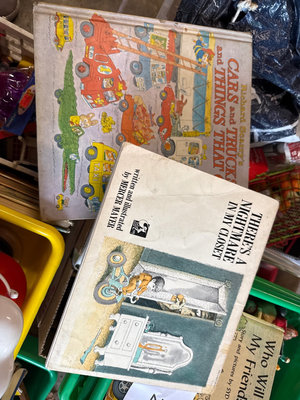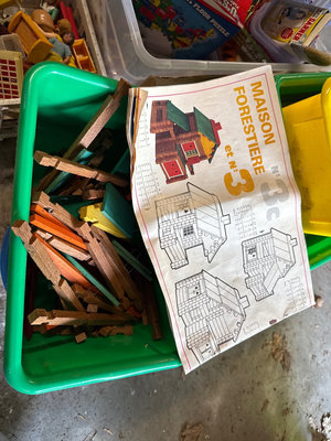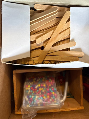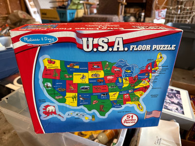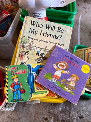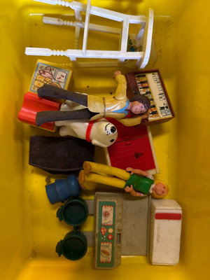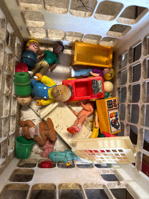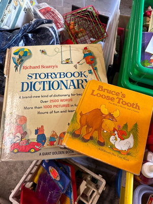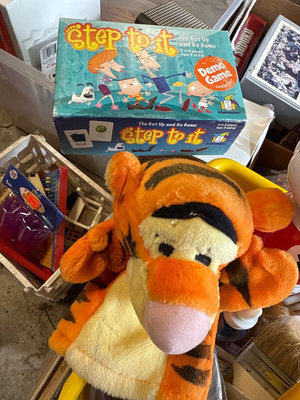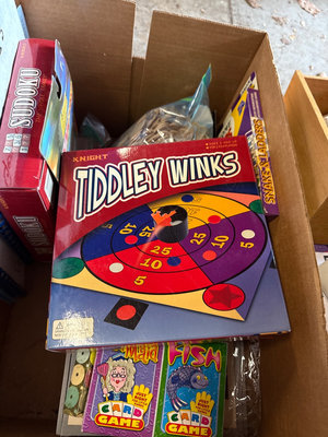 A mixed collection of vintage kids' items including an original slinky in the box, die-cast cars, plastic figures, dolls, wooden blocks and miniatures, bead kits and beads, glitter glues and paints, brushes, and various game boxes and puzzles such as a USA floor puzzle, Tiddly Winks, Snake & Ladders, Old Maid and Fish. Also includes children's books and dictionaries and a plush tiger. Located in garage. Mixed conditions and not checked for completeness