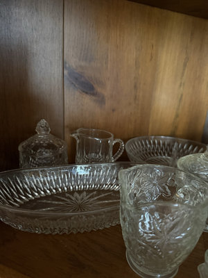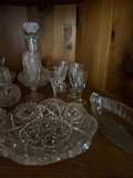 Assorted vintage and antique cut-glass items including a decanter with a faceted stopper, a large starburst/crystal bowl, a rectangular lidded crystal dish, a small lidded jar, and several goblets and stemmed glasses; includes Westmoreland glass pieces.