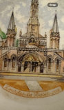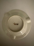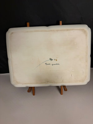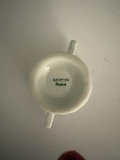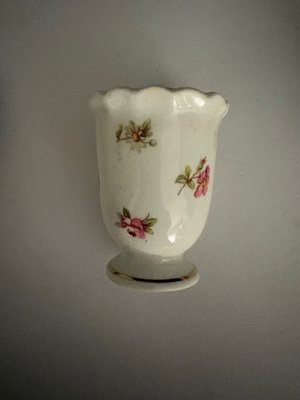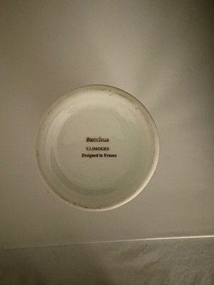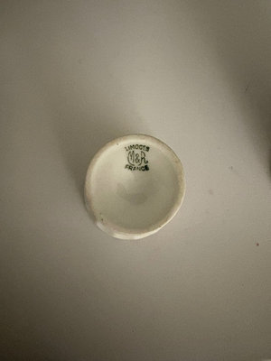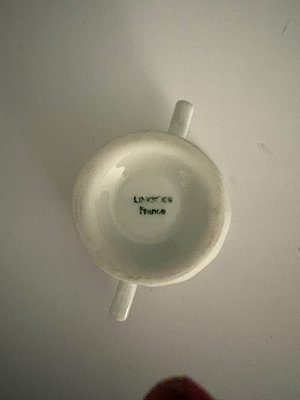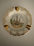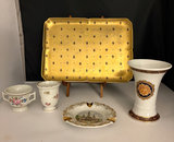 Hand painted gold flor de lis vanity tray, no maker’s mark , only “hand painted” probably dated late 19th century. 10.5” long, 7.5 “ wide.. Vase made between 1970s-80s is labeled “Bacchus”, This is a T. Limoges Bacchus porcelain vase, featuring a mask of the Roman god of wine, Bacchus, with cobalt blue and gilt accents. Ashtray depicts Sanctuary for our lady of Lourdes Basilica , 1940s. It is a porcelain piece manufactured by Jammet Seignolles in France. Next is a vintage porcelain egg cup with china floral design and gold trim. Finally , a double handle porcelain mini cup, 2” tall, 2.5” diameter , with a gold gilt design inside .