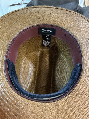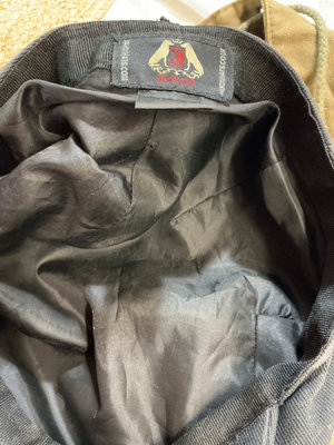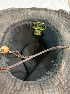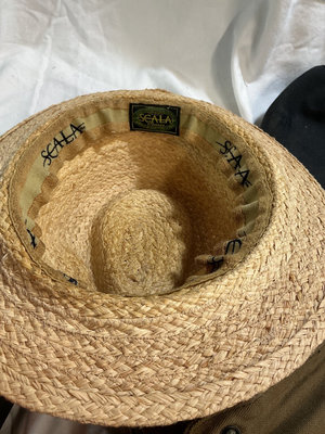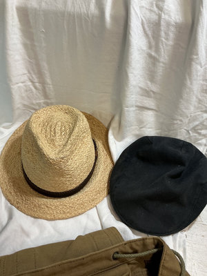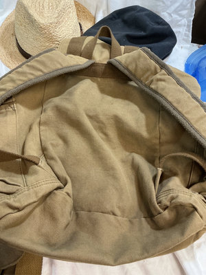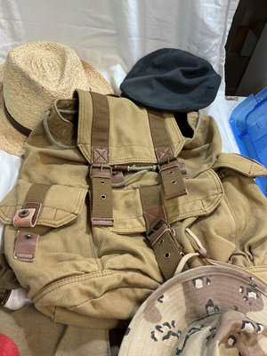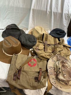 An assortment of vintage outdoor headwear and canvas rucksacks, including a straw sun hat with a Scala label, dark fabric hats, and a tan canvas backpack with leather buckle straps and a red cross emblem; a second tan pack with a zippered pocket.