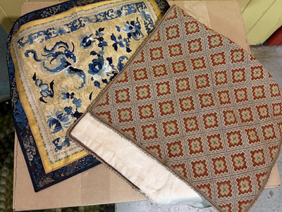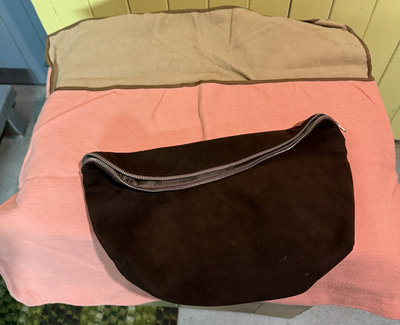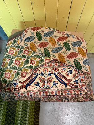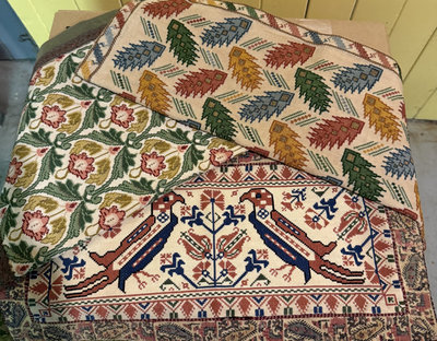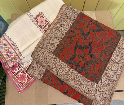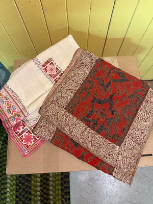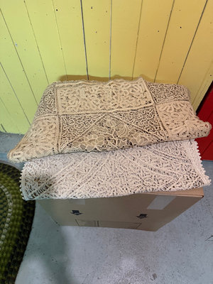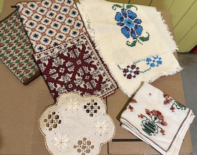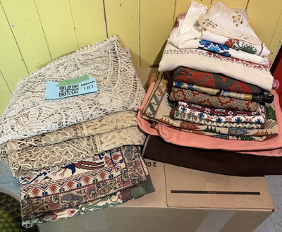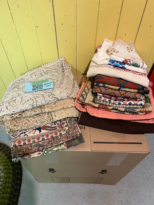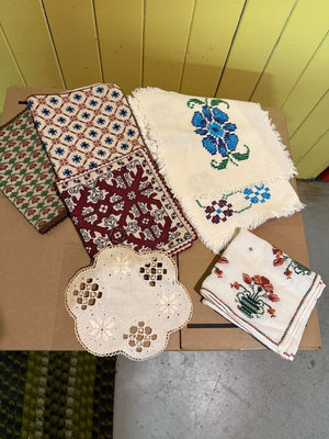 A collection of vintage textiles including lace doilies, embroidered linens, woven and printed table runners, and folded fabric pieces with floral and geometric patterns, plus a brown suede zippered pouch. Vintage handiwork embroidery, cross stick, needlepoint. ** BRING OWN PACKING MATERIALS