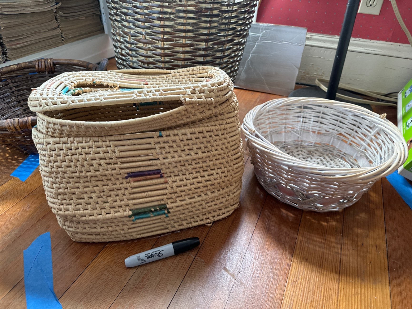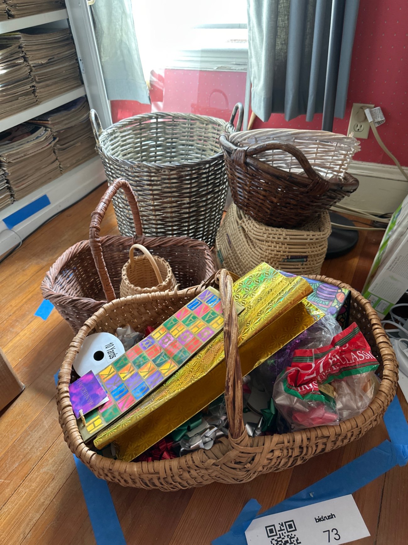 A collection of woven wicker baskets in several shapes and sizes (round, oval, and rectangular) accompanied by gift wrap materials such as ribbons and patterned wrapping paper.