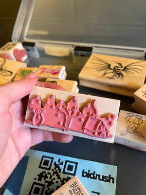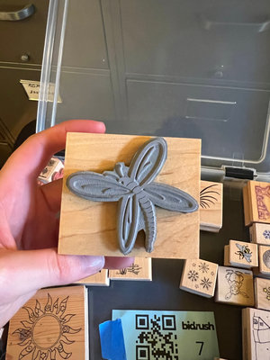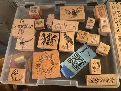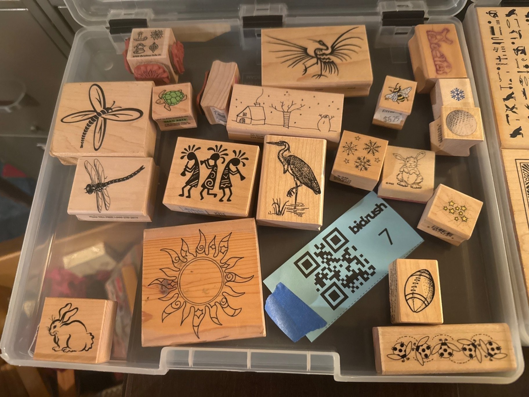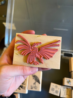 An assortment of wooden rubber stamp blocks with designs such as dragonfly, sun, phoenix, birds, animals, snowflakes, houses, and decorative borders.