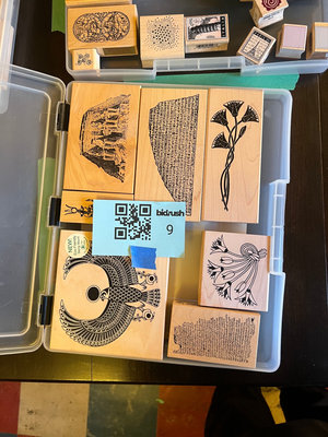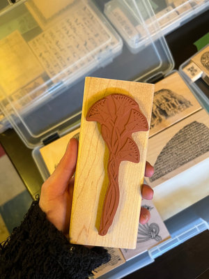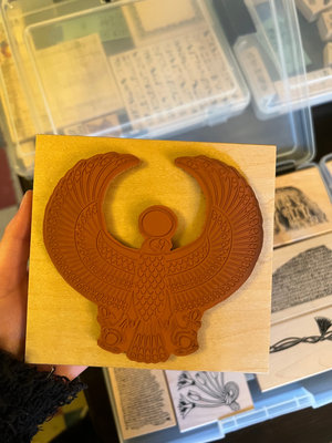A collection of wood-mounted rubber stamps featuring varied designs such as birds, floral motifs, architectural or inscribed imagery, and other historical-inspired illustrations.