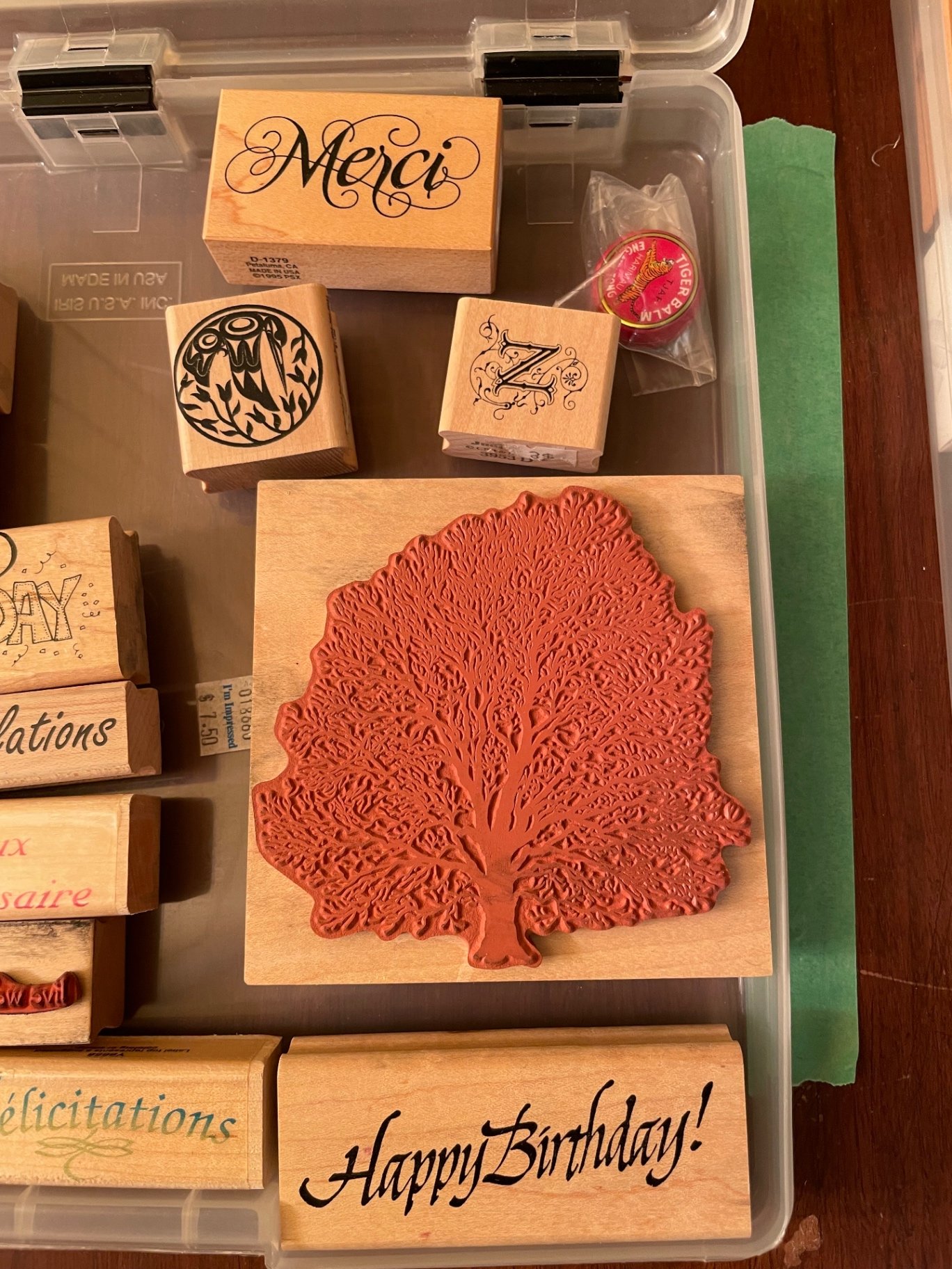 A collection of wooden blocks with rubber stamp designs, featuring botanical motifs such as trees, leaves, flowers, and fruit, along with multiple greeting phrases including Peace on Earth, Seasons Greetings, Happy Birthday, Congratulations, Joyeux Anniversaire, and Félicitations.