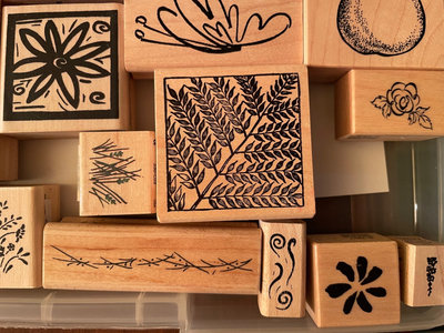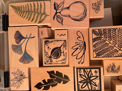 A collection of wooden stamp blocks featuring botanical and floral designs, including leaves, ferns, flowers, berries, and a pear motif.