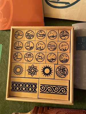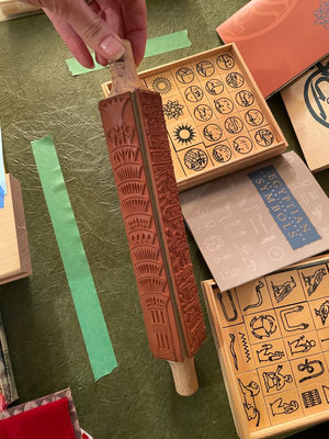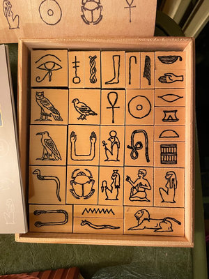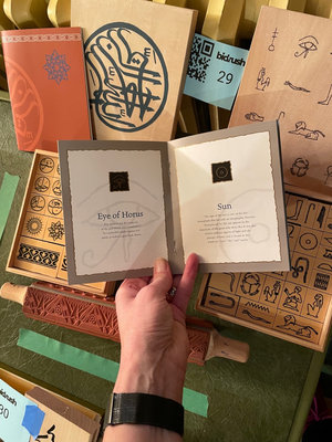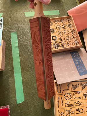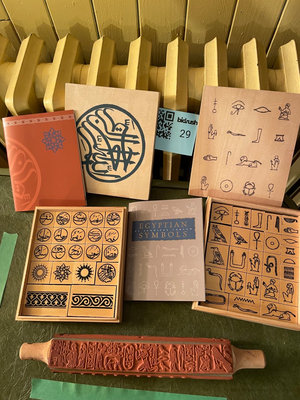 A collection of wooden stamp blocks with Egyptian hieroglyphic symbols, a carved stamping roller, and accompanying guidebooks about Egyptian symbols. **BRING OWN PACKING MATERIALS.