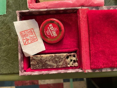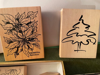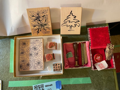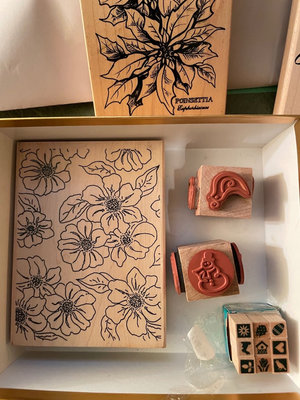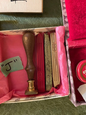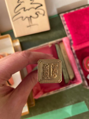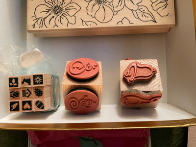 An assortment of floral rubber stamps, carved stamp blocks, and custom wax seal with letter J and wax sticks.