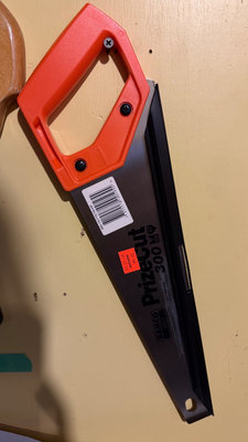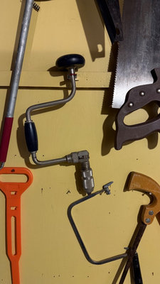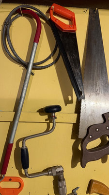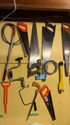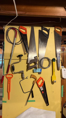 A collection of hand tools mounted on a pegboard, including multiple saw blades and frame saws, a hacksaw, a coping/bow saw, a brace and bit, a bow drill with knob, a coil of wire, and various file/rasp and miscellaneous cutting tools. UNTEST, as is as found. ** BRING OWN PACKING MATERIALS