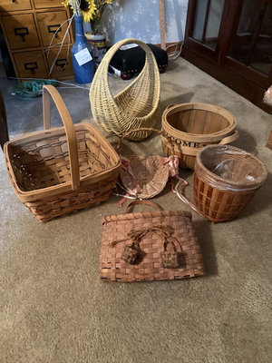 A collection of woven wicker baskets and containers in multiple shapes and sizes, including rectangular tote, square and round baskets, a cylindrical container, a small round basket with ribbon decorations, and a wooden 'WELCOME' basket, some with interior liners or woven handles.