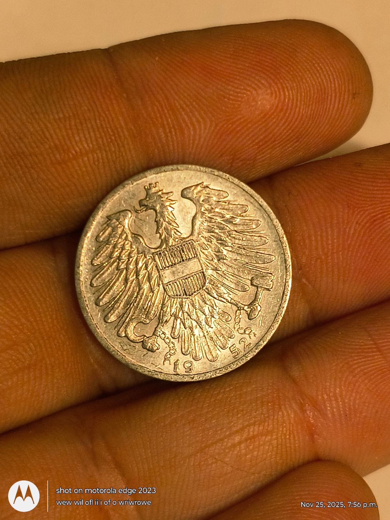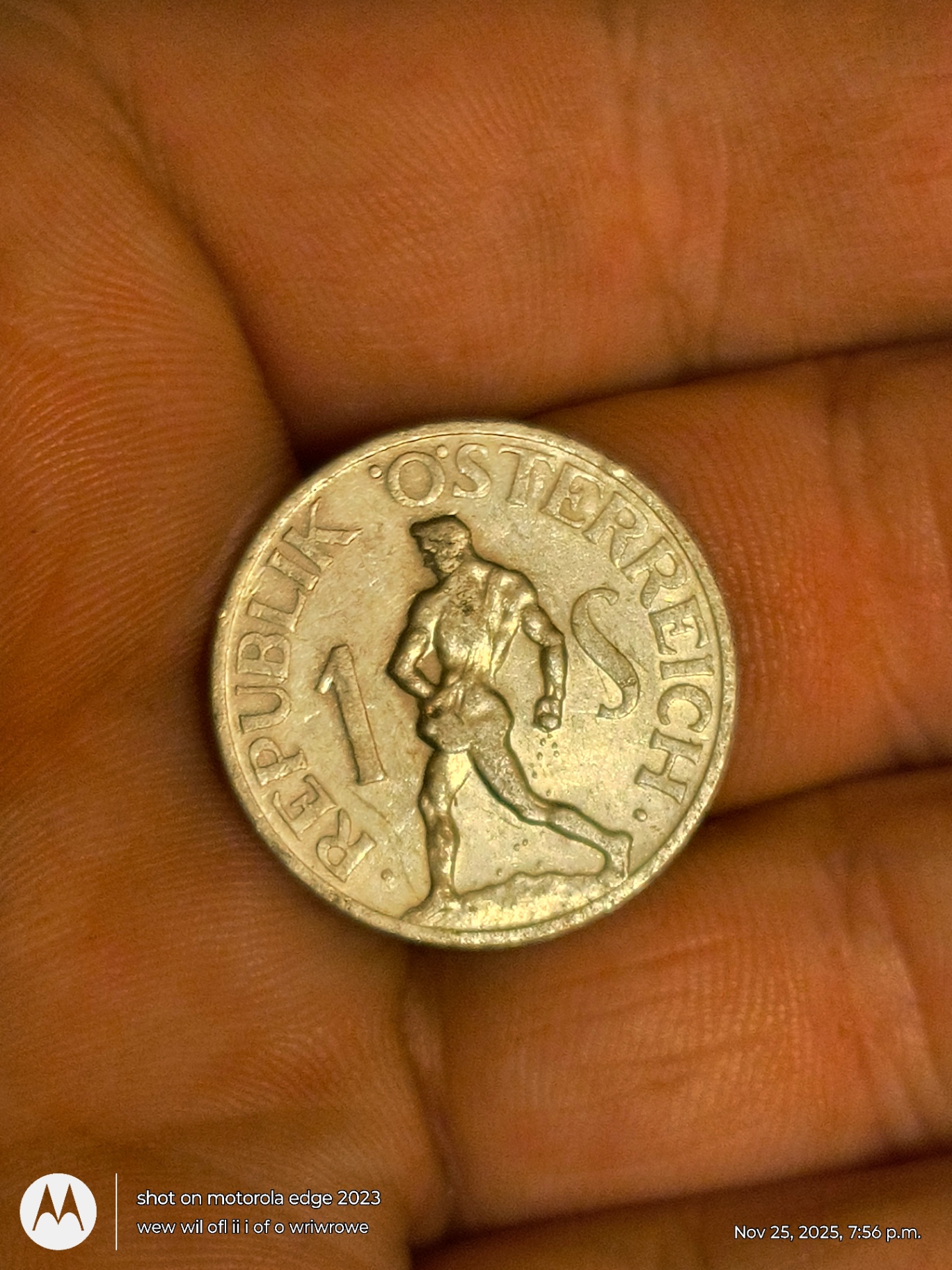 A silver-colored Austrian 1 Schilling coin with the obverse showing a walking figure and the inscription REPUBLIK ÖSTERREICH, and the reverse depicting a heraldic eagle with a shield.