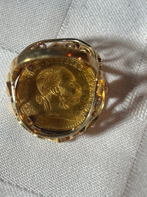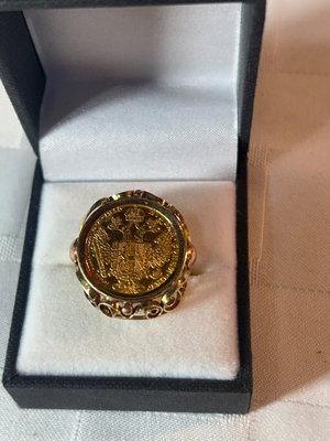 This is a ring featuring an Austrian 1 Ducat gold coin restrike, which contains .1106 oz of .986 fine gold. The coin's reverse side, visible in the image, displays the crowned imperial double-headed eagle of the Hapsburg dynasty, symbolizing the Austro-Hungarian Empire. The coin features the date "1915" as a restrike, not the year of minting. No sizing available.