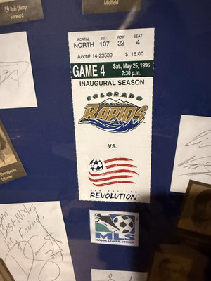 Blue display board featuring numerous signed player headshots and autograph notes surrounding a central inaugural-season MLS game ticket for Colorado Rapids vs New England Revolution, with MLS logos and related stickers.