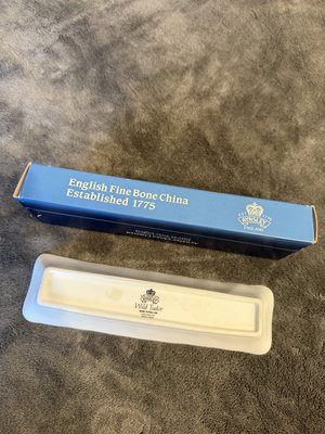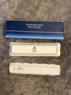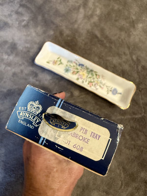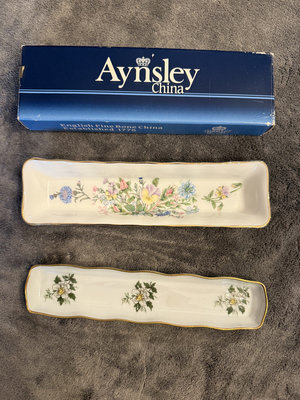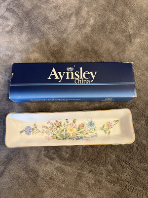 A set of English Aynsley porcelain trays with floral designs and gold trim, including multiple rectangular serving trays and a pen tray; comes with the original Aynsley blue box labeling English Fine Bone China. 81/2"