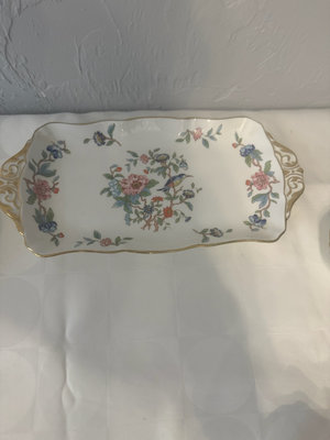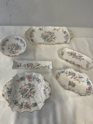 Six pieces of Aynsley Pembroke porcelain dinnerware in a matching floral pattern with gold trim. Includes a large scalloped rectangular platter, two elongated dishes, a narrow rectangular dish, a shell-shaped bowl, and a round floral bowl. All pieces feature the Pembroke design mark on the base. 6x12, 8x1, 5' bowl, 8x2