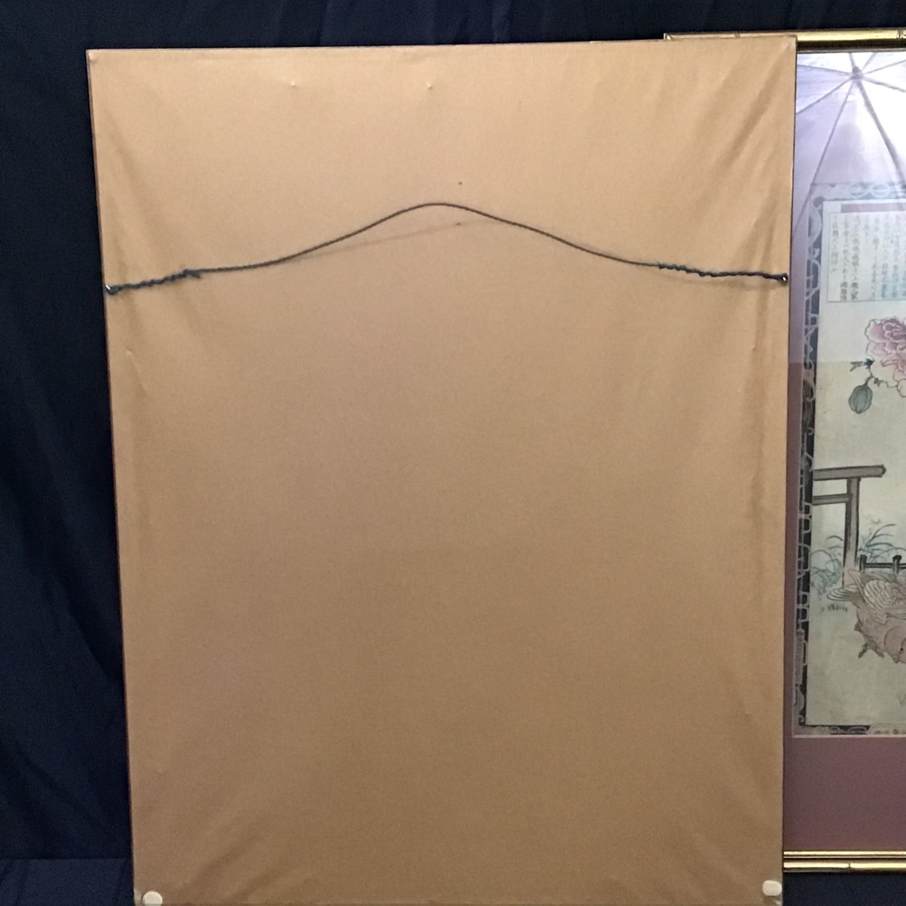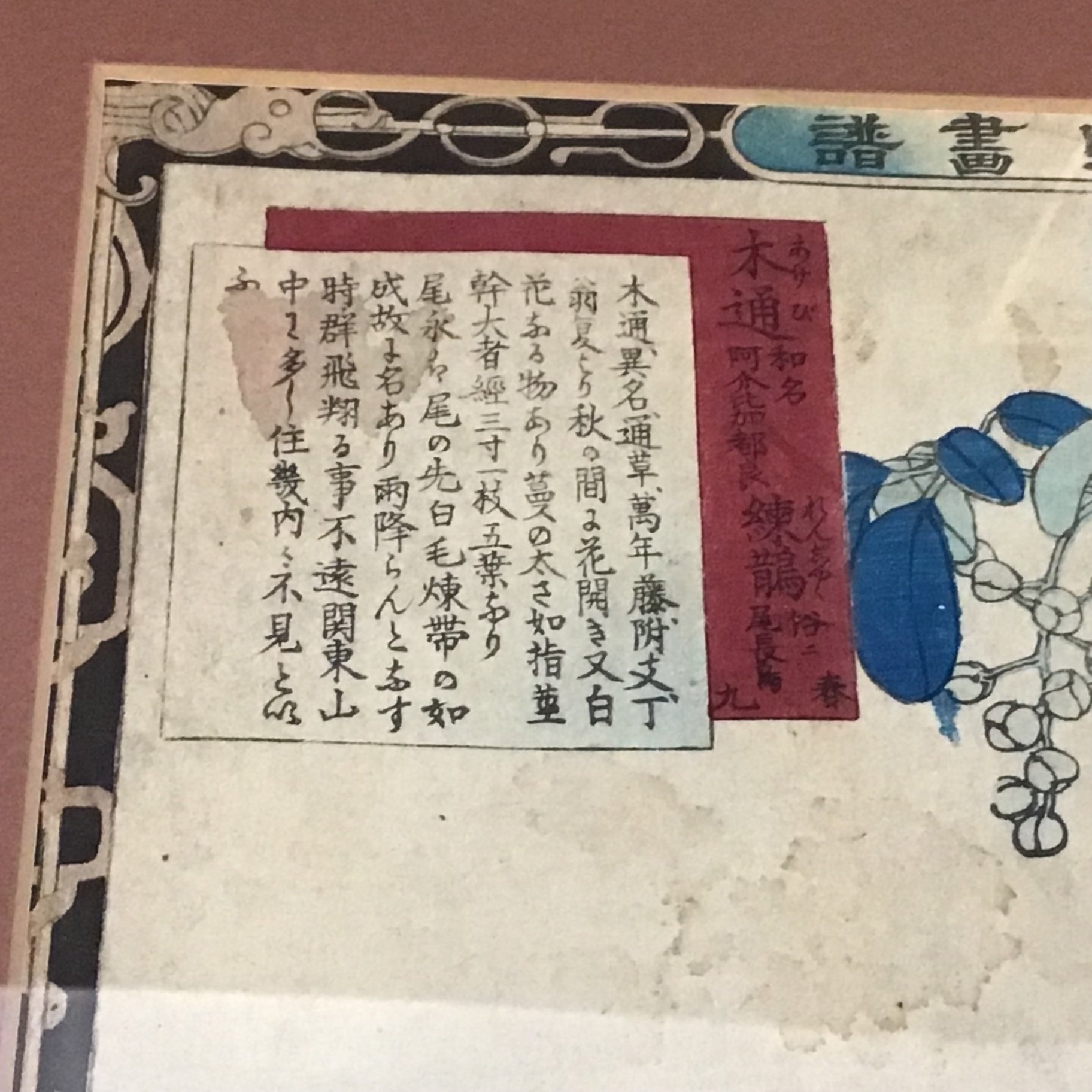 Kono Naotoyo Bairei (1844-1895) "Chocolate Vine and Magpie" and "Poppy and Pigeons" from Bairei's Album of Flowers and Birds, framed woodblock prints. Art 14.25x9.25, frame 21.5x16.5. 2 pieces.