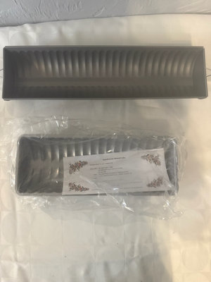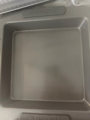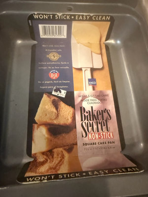 A collection of bakeware items including Baker's Secret non-stick loaf pan and square cake pan, a floral-patterned baking sheet liner, and additional metal baking pans/trays.