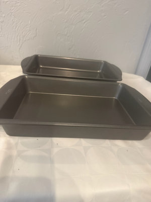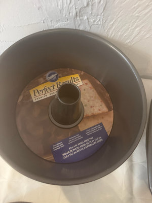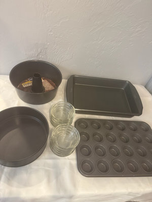 A collection of bakeware consisting of an angel food (center-tube) pan, a round springform/pan, two loaf pans, a rectangular cake pan, a multi-cup muffin pan, and 10 custard dishes