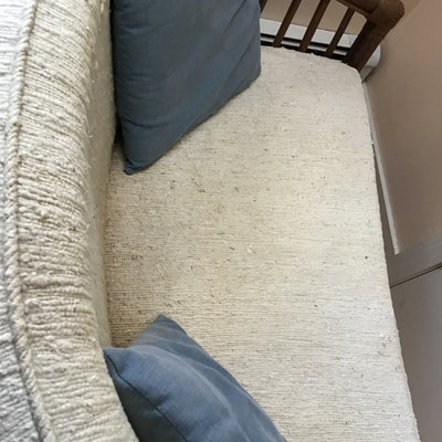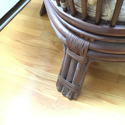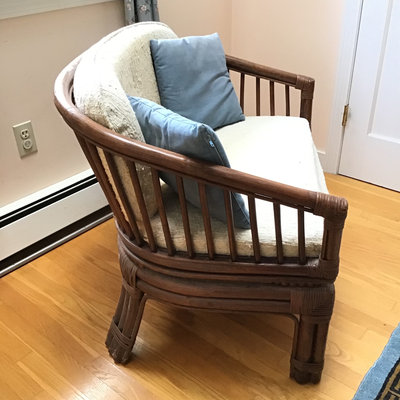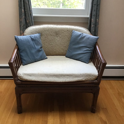 Bamboo and cream colored boucle upholstered wide chair. Chair cushions have some staining on fabric, but have been included for form. Throw pillows NOT included. 43.25x25x30. 1 piece.