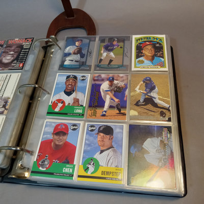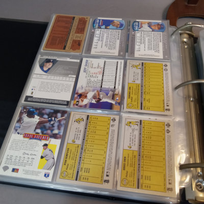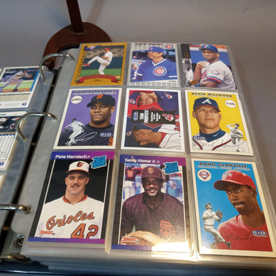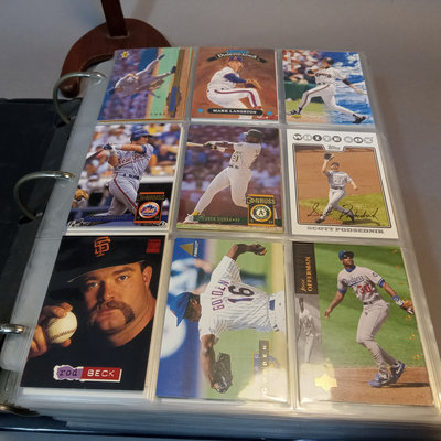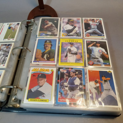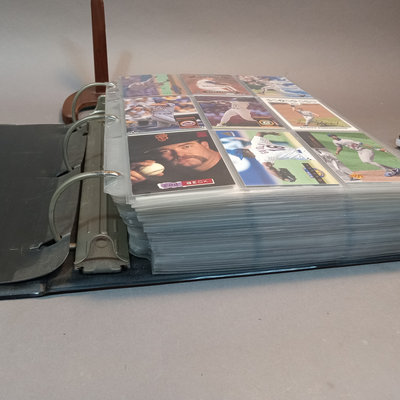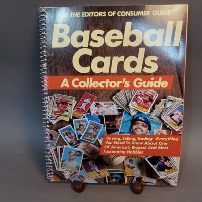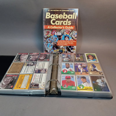 Baseball Cards: A Collector's Guide, 1982 plus a large binder with 80 sheets of baseball cards, 1980s to 2000s, unsorted, with duplicates, from Fleer, Topps, Skybox, Score, Don Russ, Upper Deck, Bowman, and more. 2 pieces.